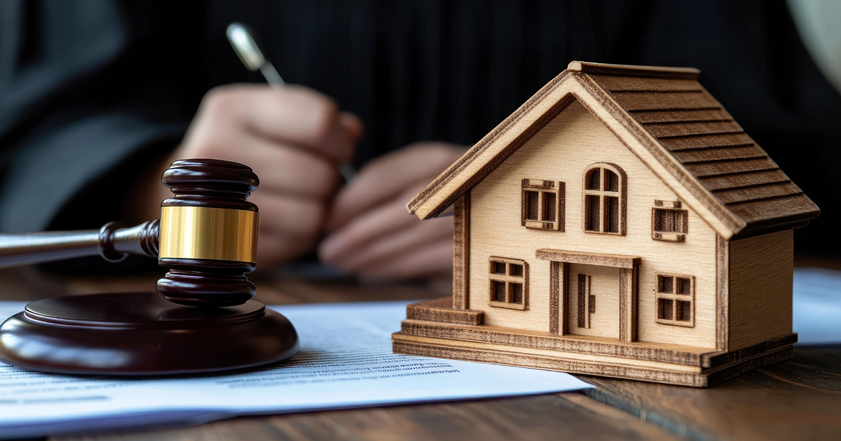 House model and gavel on paperwork.